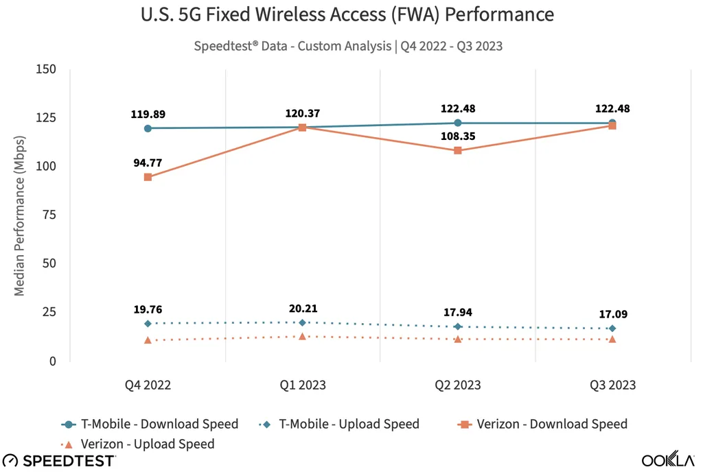 Verizon は顕著な改善を見せ、2022 年第 4 四半期の 94.77 Mbps から 2023 年第 3 四半期には 121.23 Mbps まで増加し、T-Mobile とほぼ同等になりました。