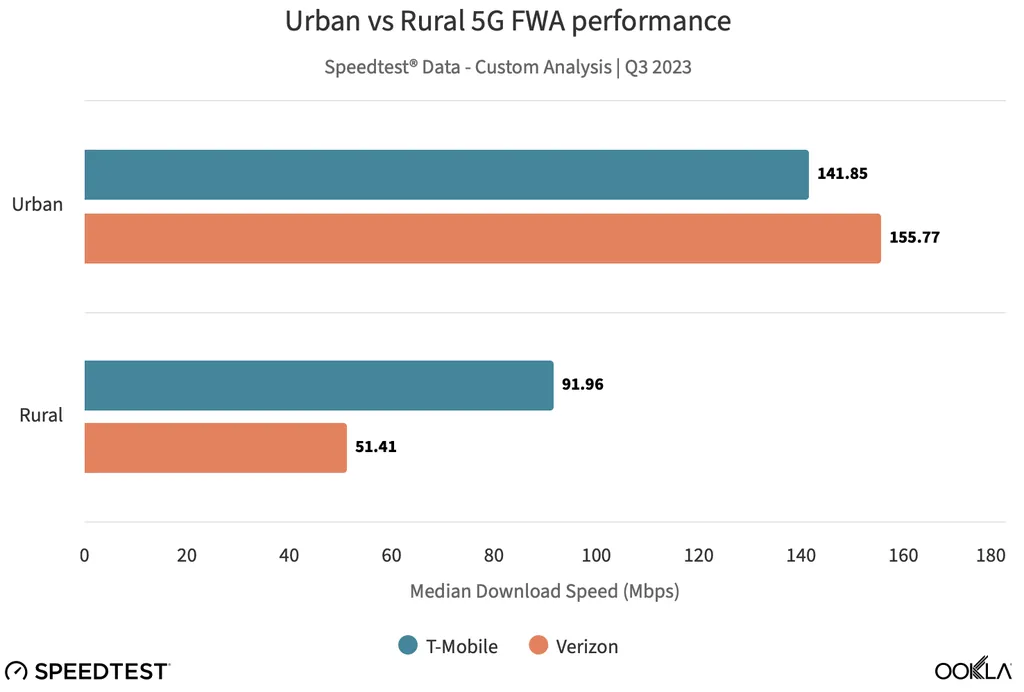 しかし、地方の顧客にとっては、T-Mobile が平均速度 91.96 Mbps で大きな差をつけてリードしました。